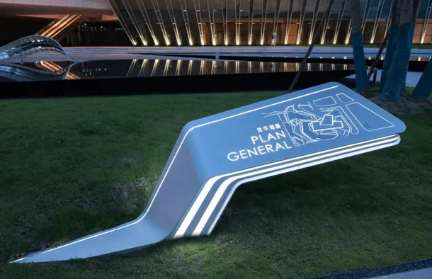 為了提供給初次來訪者正確的方位引導而設立,它應該包括各功能建筑指示圖,行進路線指示標識等,不僅要求易讀易認,信息明確,還要與園區的環境相融合,視覺上整體協調,引導標識一般包括總平面圖和指示標識,總平面圖是放置在園區的入口處的總體平面指示,顯示園區各功能建筑和通行及參觀路線。